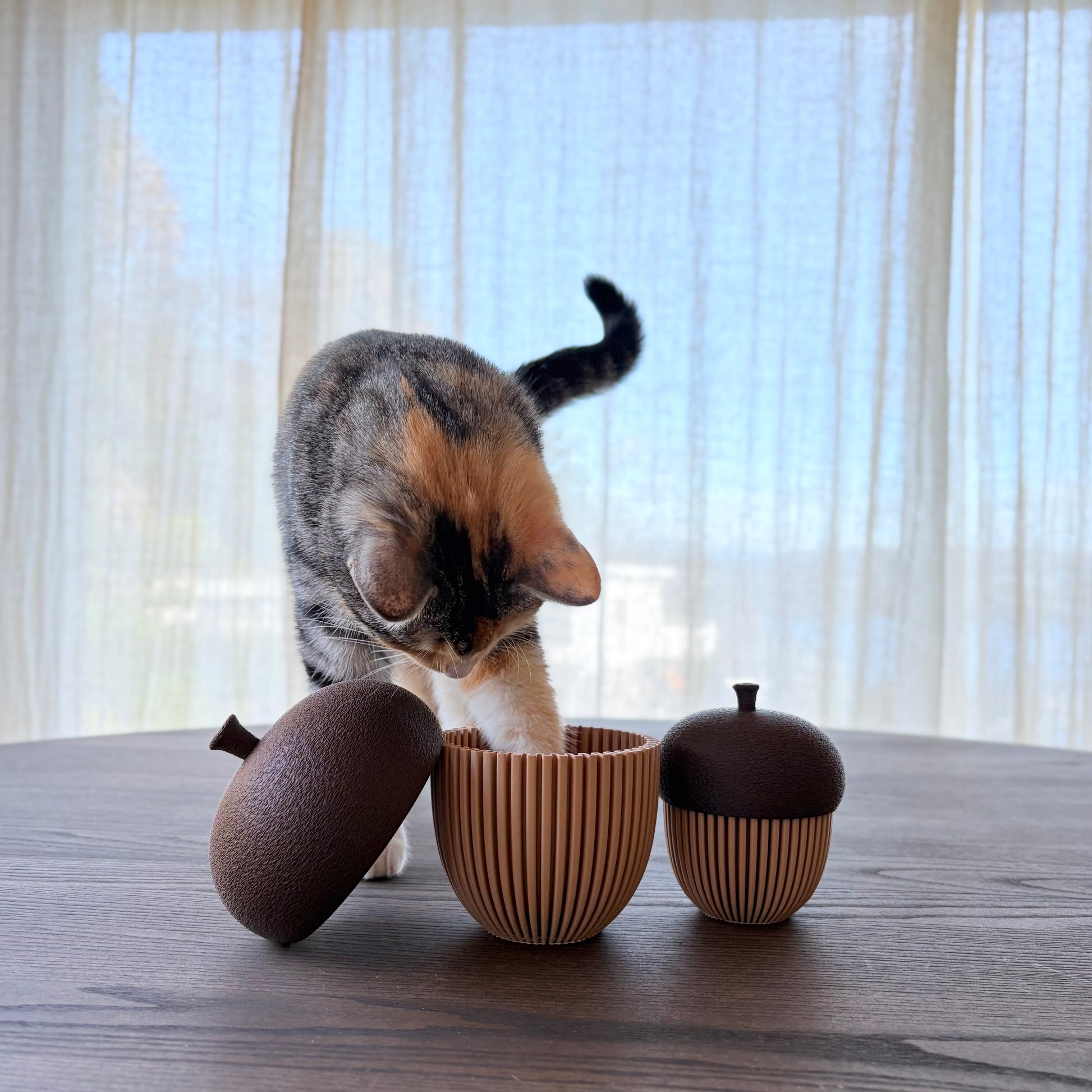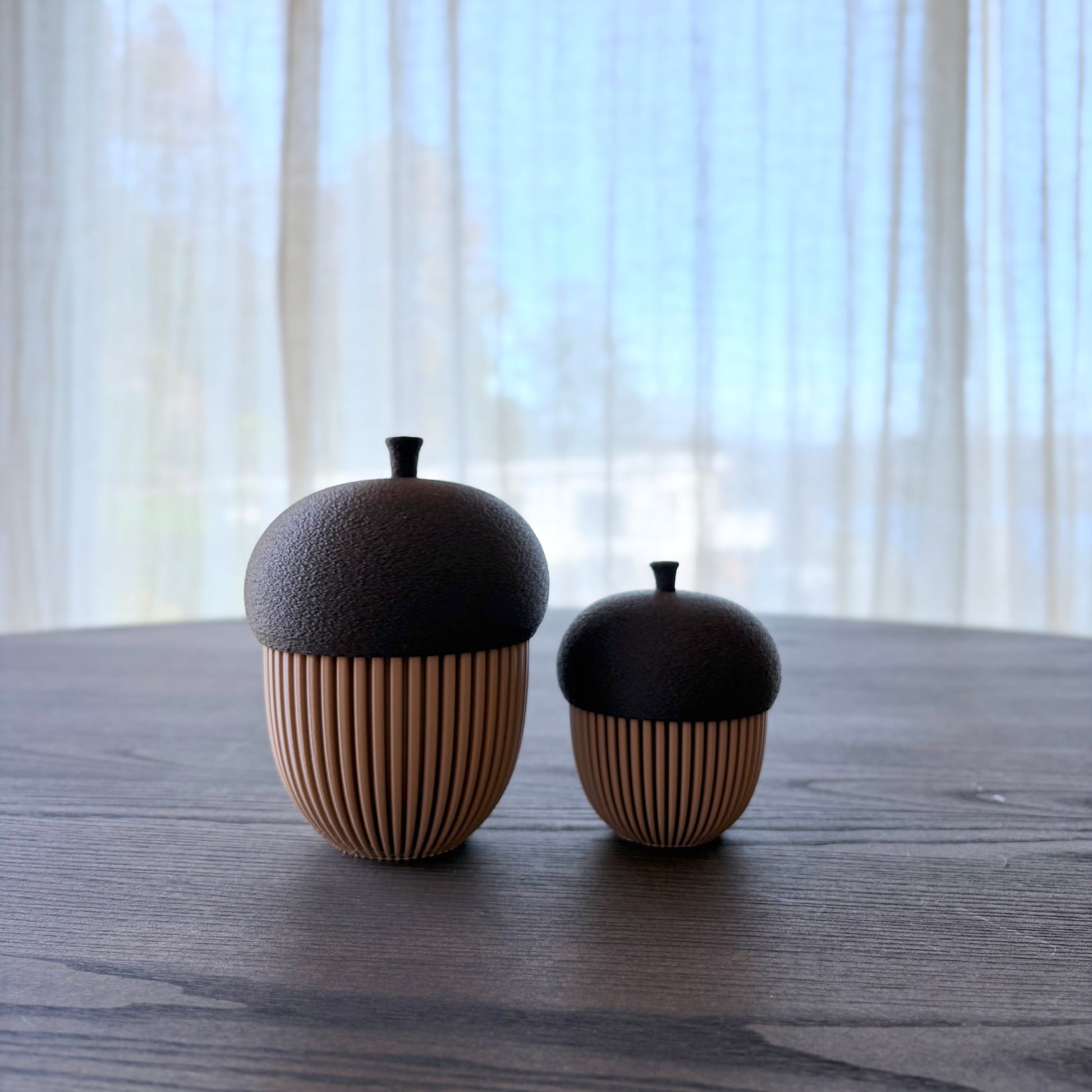 Dekorative eikenøtter inspirert av høstens varme fargetoner og naturens organiske former. Kroppen har en elegant rillet overflate i Latte Brown, mens lokket har en myk, teksturert finish i Brown Chocolate – printet i “fuzzy mode” for et naturtro uttrykk.